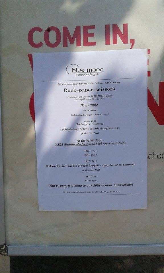 On 3rd June, 2017 Blue Moon School of English celebrated its 20th anniversary and hosted the 14th YALS In-house Seminar. Ten schools with 27 participants took part in this event called Rock-paper-scissors and covered 2 workshops. The presenter was Aleksandra Nađ from Blue Moon School.