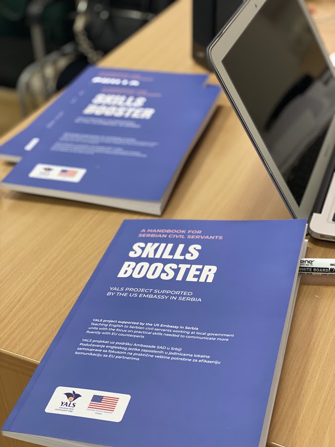 Za ovu svrhu, YALS-ov tima za izradu nastavnih materijala je priredio poseban priručnik “Skills Booster” koji odslikava funkcionalni jezik i veštine relevatne za situacije u radu državnih službenika, kao što su sastavljanje CV-ja, aktivno učešće na sastancima, pisanje formalnih mejlova/dopisa, pravljenje I držanje prezentacija I upotreba korisnih digitalnih alata, u okviru tema vezanih za društvene, urbanističke I privredne delatnosti, kao i kulturu evropskih partnera, SAD i Srbije.